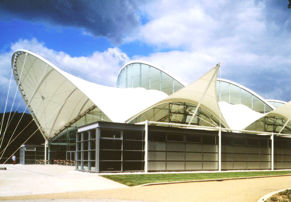 二、張拉式膜結(jié)構(gòu):以膜材、鋼索及支柱構(gòu)成,利用鋼索與支柱在膜材中導(dǎo)入張力用以固定。除了可實(shí)現(xiàn)不同風(fēng)格和美觀的造型外,也是能夠充分展現(xiàn)膜結(jié)構(gòu)創(chuàng)新精神的構(gòu)造形式。艾爾豪斯的張拉膜建筑,歷來以施工精度要求高,結(jié)構(gòu)性能強(qiáng),且具豐富的表現(xiàn)力而著稱。